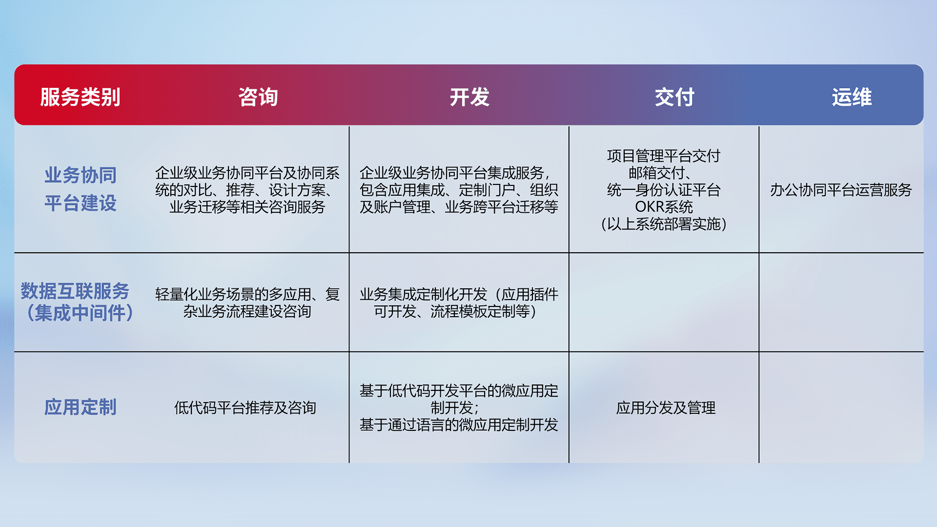 针对钉钉、、、、企微、、、、IDaas等平台级产品提供产品的规划、、、、方案、、交付、、、、定制化开发等服务,,实现如统一协同办公、、智能客户服务、、、、混合会议管理、、、、智能数据查询、、等业务场景,,,实现数字化转型。。。