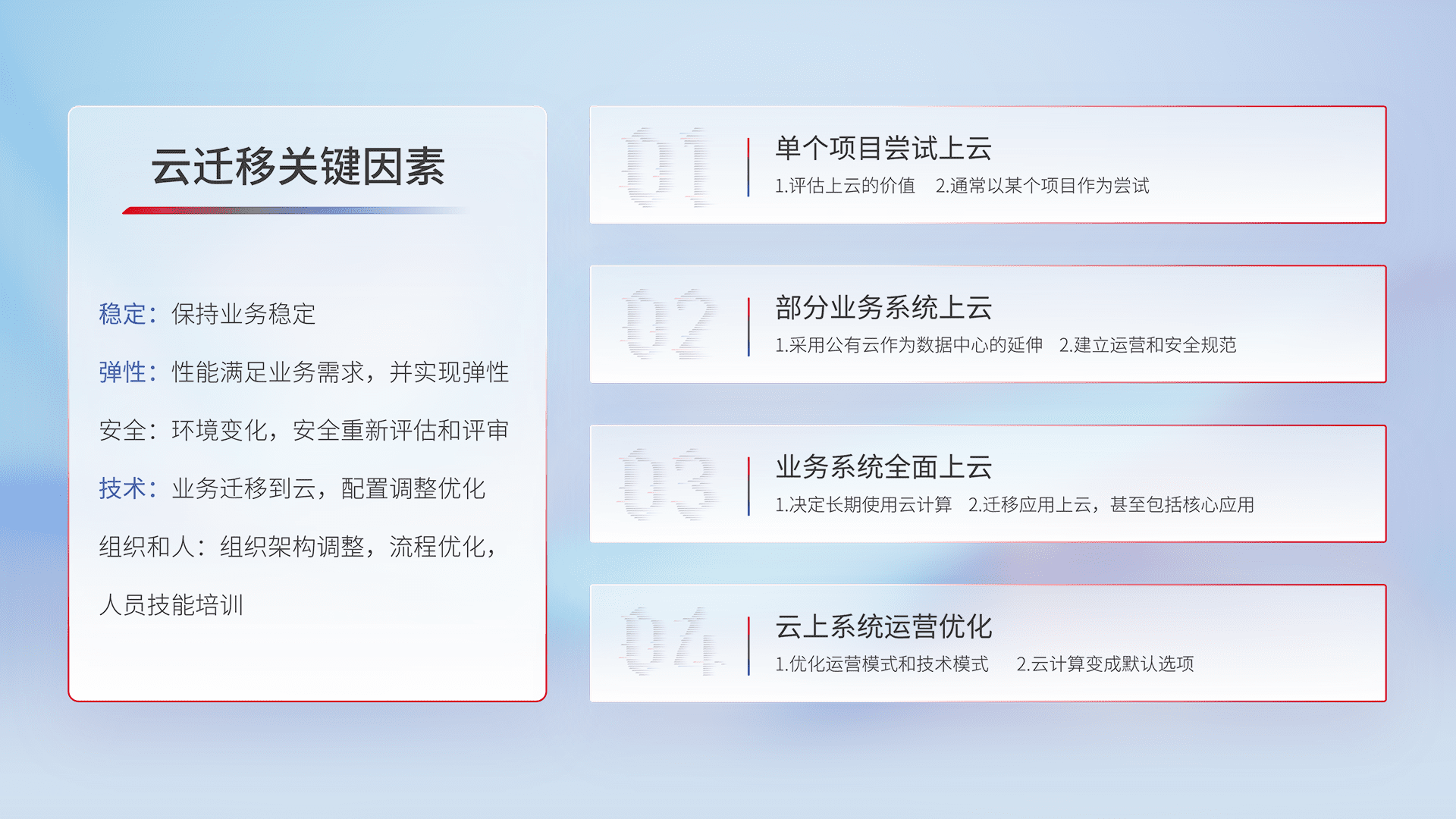 结合实际业务,,,从规划设计、、云平台选型、、、、云原生改造、、、、数据迁移、、集成交付,,,,迁移全过程为客户识别最佳上云路径,,,,做好风险识别管理,,设计网络架构、、、、身份权限、、、、安全审计合规、、操作审计、、日志审计、、监控告警策略、、、多站点容灾设计等,,,,对云上基础设施进行整体规划,,,,提升IT治理水平,,以满足弹性、、、高可用、、高性能的需求。。。。