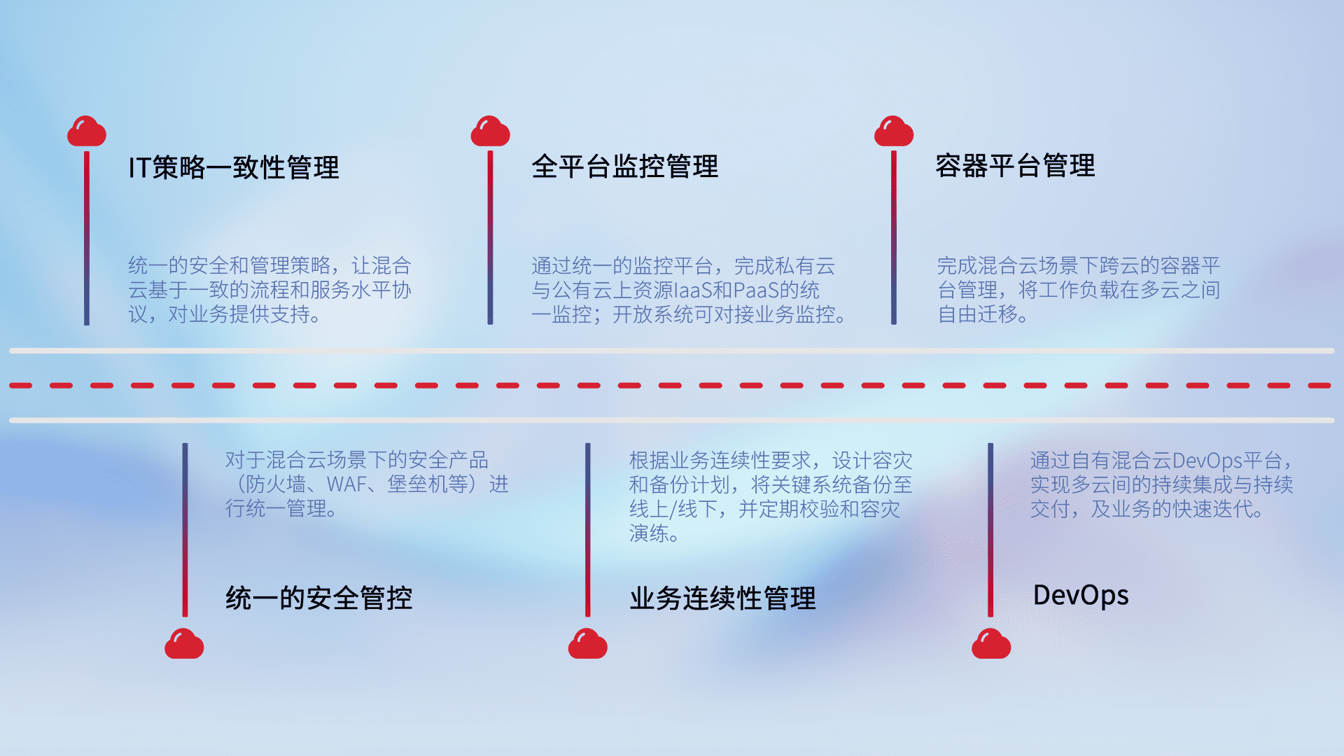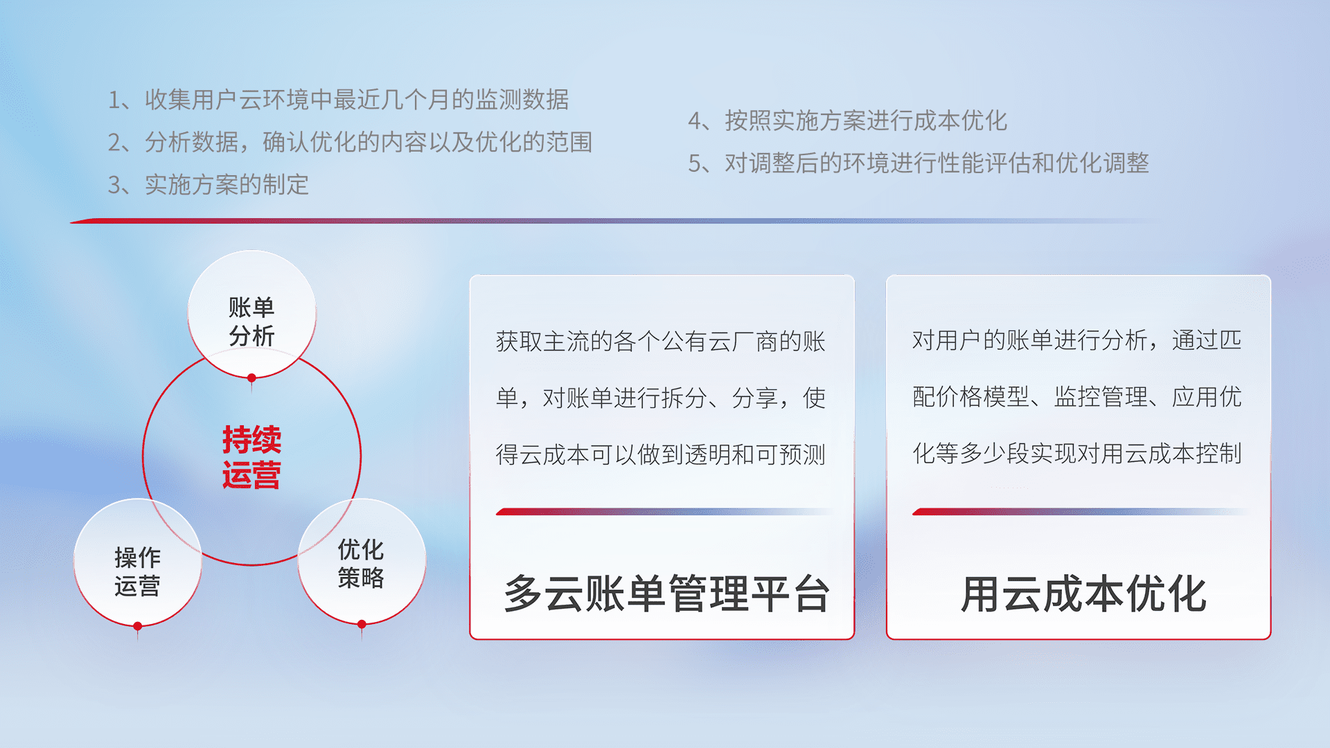 通过多云纳管,,以统一的资源数据模型把客户的云资源进行抽象和封装,,,,进而实现对多云资源的统一操作,,,,保障云资源管理的可靠性、、稳定性与可用性。。量身定制化运维内容,,配置、、、开发运维、、、补丁管理、、、备份、、监控、、、、认证和访问管理、、、、审计和日常巡检等,,保障在用云过程中的可靠度,,,稳定度以及高可用率。。。
