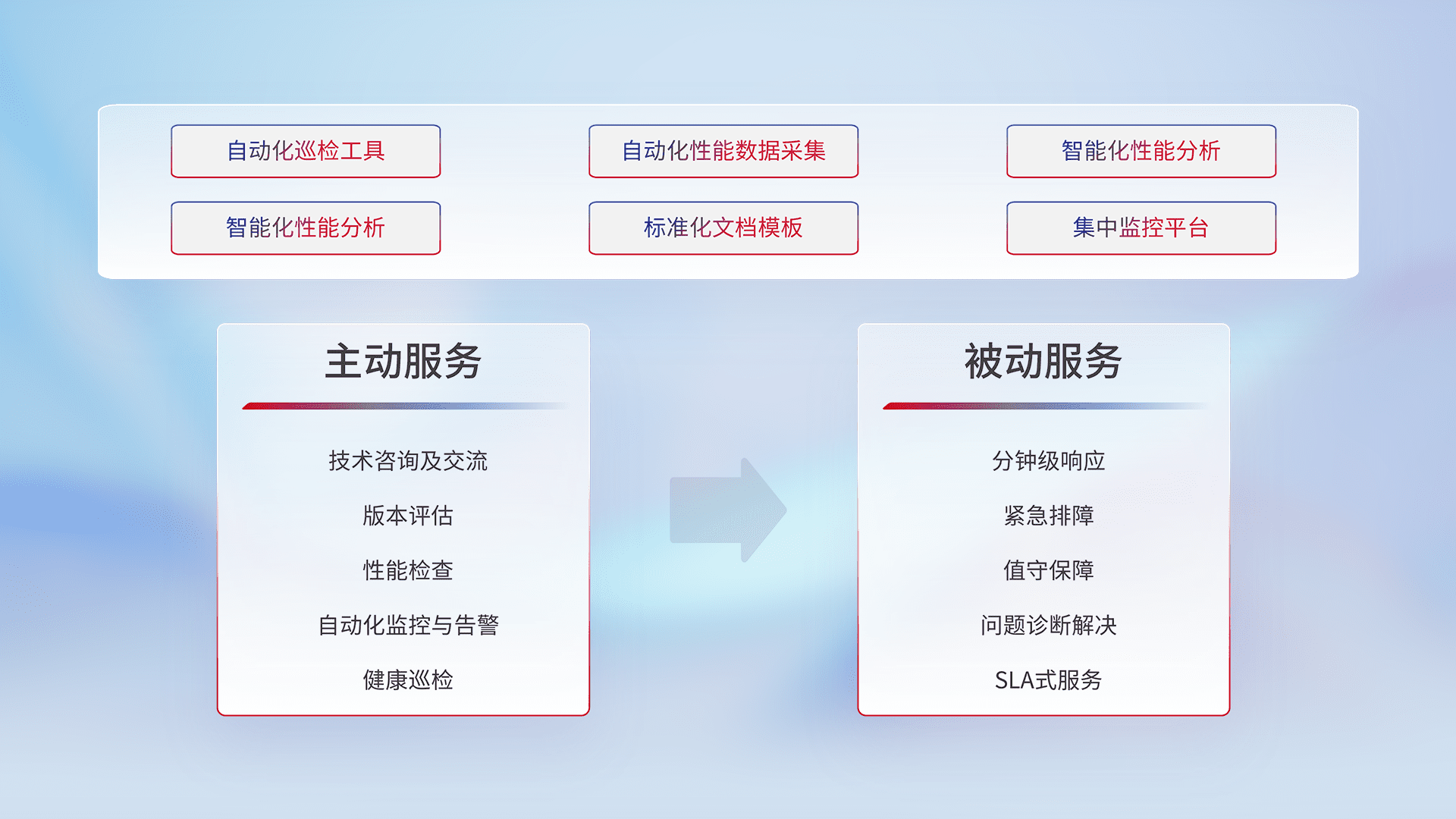 智能化工具和标准化文档,,保障服务质量,,提供主动服务(包含技术咨询、、版本评估、、、性能检查、、、、自动化监控与告警、、、健康巡检)和被动服务包含(分钟级响应、、、、紧急排障、、、值守保障、、、问题诊断解决、、SLA服务)。。。。